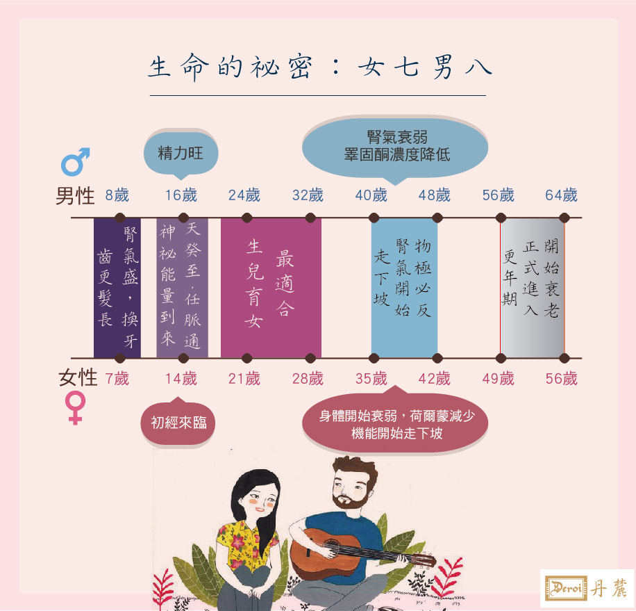 而男性約56 歲時(8×7=56),所有的功能漸衰弱,筋骨彈性不如前,漸漸邁入老年階段。
